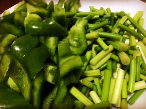 青椒切菱形块,青蒜叶切段(家里没有,用蒜薹替代,切段)