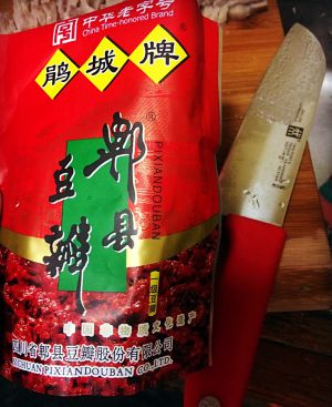 肉炒出油(不要炒太干)后,小火放豆瓣酱,翻炒均匀