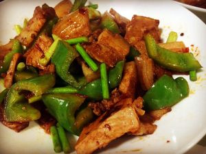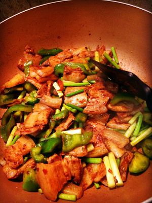 热锅倒油,加入肉片炒三到五分钟。加入姜葱末,青红椒,甜地瓜片,炒两分钟出锅。回锅肉的香浓