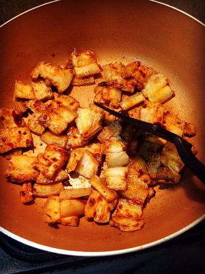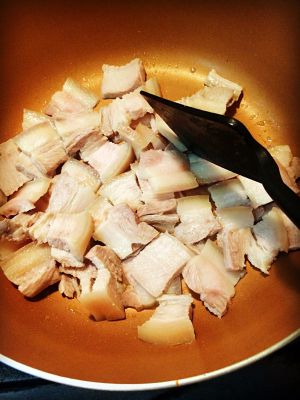 锅烧稍热,放一点儿油即可,五花肉下锅不停翻炒至出油。
