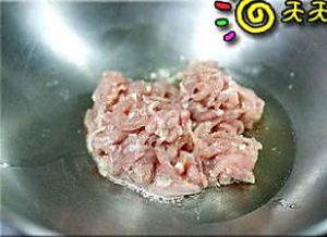 腌制好的鸡丝加少量食用油,上锅炒熟,盛出备用