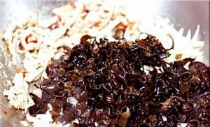 胡萝卜切丝,青椒切丝,泡发木耳撕小片。