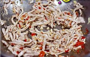 待肉丝炒至白色时,倒入泡红椒,和蒜容姜粒出香味