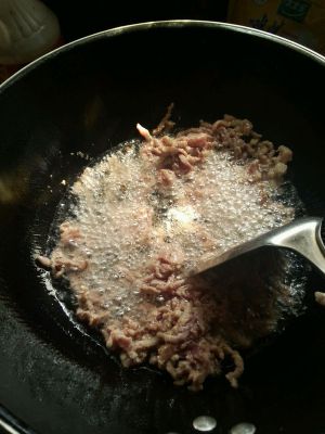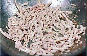 锅烧辣,加入适量食用油(比平日里炒菜多放一点),倒入肉丝翻炒至白色