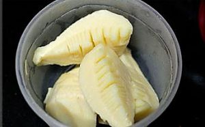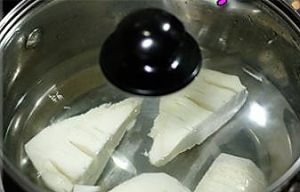 把笋对切4块后,放在锅里,和冷水一起盖上锅盖煮熟