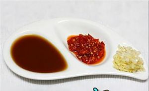 用生抽、醋、砂糖、生粉、清汤或清水兑成芡汁,取一大勺剁椒及适量姜末待用