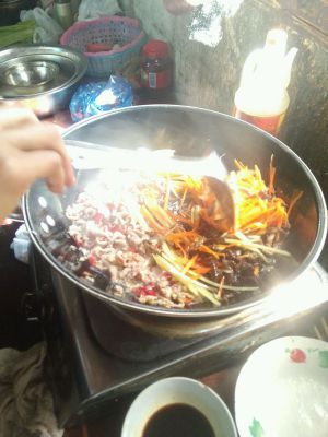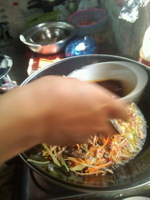 炒锅烧油,加一勺郫县豆瓣,喜欢吃辣的可以再加一只切碎的红尖椒,炒出红油,加入葱姜蒜炒香,将备好的萝卜丝,木耳,青椒,肉丝依次放入煸炒,菜丝断生加入调料汁,挂糊出锅。
