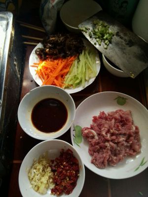 准备所有材料:瘦肉切丝,泡红椒剁碎,姜蒜切碎,木耳,胡萝卜,莴笋各切丝待用,小葱切段儿,调制鱼香汁(陈醋一小勺,生抽一小勺,淀粉适量)