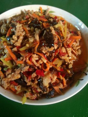 半小时后,将肉丝放入油锅里大火爆炒,变成白色后盛起,将多余油倒出,留少量油再锅里,放入干辣椒两个,葱姜蒜,10秒后倒入辣椒,胡萝卜,木耳用大火爆炒,一分钟后然后放入肉丝,加入酱汁,再爆炒,等炒的快熟时倒入淀粉水,注意一定是要边倒边炒,再翻炒半分钟,完工!