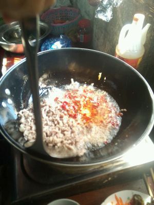 锅内少许油烧至六成热下入肥肉,炒香吐油