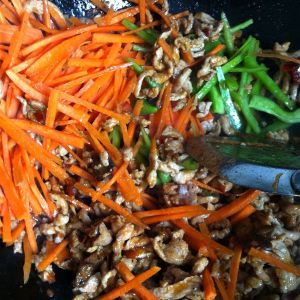 放入胡萝卜丝和青椒丝翻炒,倒入调好的料汁炒匀