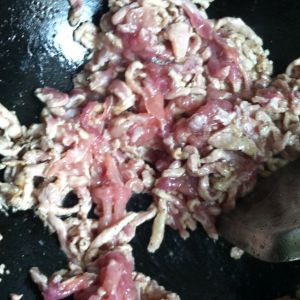 锅中入油烧至7成热,入肉丝翻炒至发白,放两勺郫县豆瓣炒匀