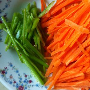 茭白洗净切丝,胡萝卜去皮洗净切丝 ,黑木耳洗切小朵,四季豆洗净去筋用手摘段 。