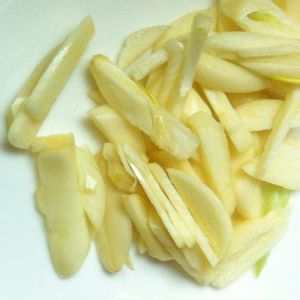 姜切片,葱切段,瘦肉切丝加姜片、淀粉和生抽拌匀腌制两分钟。