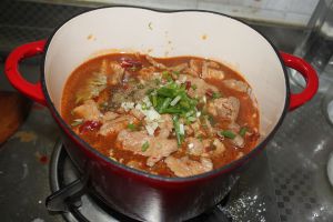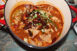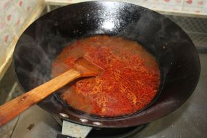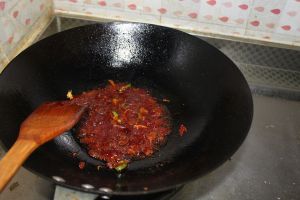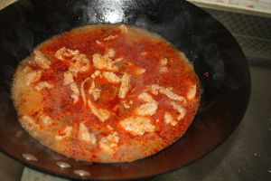 油烧热下姜蒜炒香,再下郫县豆瓣炒香,最后下朝天椒。炒香后加适量清水。煮开后下肉片,煮2分钟后起锅装盘