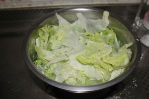 腌制肉的同时,处理生菜,生菜随意掰成大片,洗净,过一下水,时间少一点,尽量保持生菜的脆感。铺到大碗底备用。