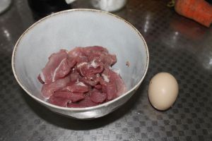 先把里脊肉洗净切片,越薄越好,开始腌肉,先放鸡蛋清,在放少许盐,在放料酒,在放淀粉,把肉抓允,腌制半个小时左右