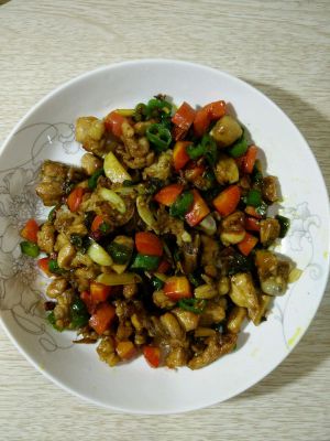 加入鸡丁。翻炒两分钟,加入盐,酱油上色,加一点点醋,还有一点白糖。再翻炒一分钟,就可以出锅啦