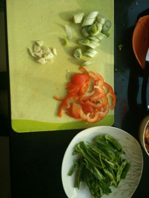接下来就准备别的材料了,杭椒和鲜红辣椒切丁待用,并且准备好葱姜蒜的量切片,等待肉腌制好