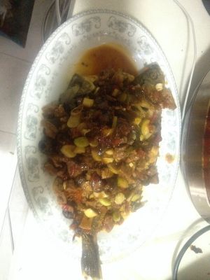 然后放入炸好的鱼大火烧开 烧开后关小火焅七八分钟 把鱼翻面儿继续焅五分钟 转成大火收汁儿 要不停晃锅以防粘锅