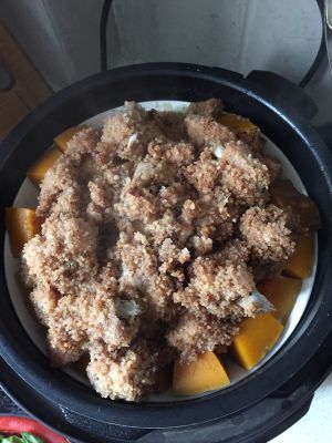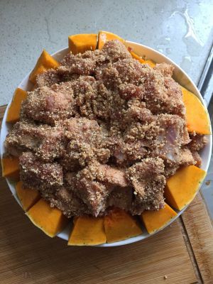 南瓜切块垫底,五花肉切片伴好粉蒸肉的粉,铺在南瓜上。五花肉肥一点没关系,油都被南瓜收了。
