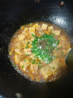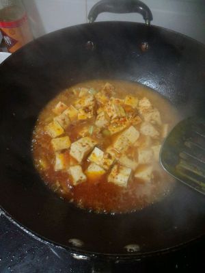 待豆腐熟后,改大火,加入由水淀粉、糖、酒、味精、酱油调好的芡汁。待芡汁均匀附着后,关火,起锅。