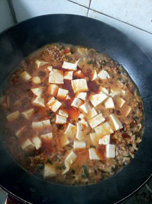 热锅倒入油,油热后加入葱姜蒜及郫县豆瓣爆炒。然后加入肉末。待肉末炒变色后加入适量水。然后加入豆腐。用铲子轻轻将豆腐分开,大火猛煮。两分钟后加入老抽,盐及鸡精。然后加入淀粉,就可以起锅了