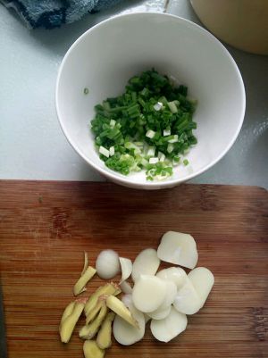 小火倒油,下姜末葱段蒜末干辣椒爆香