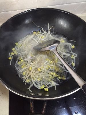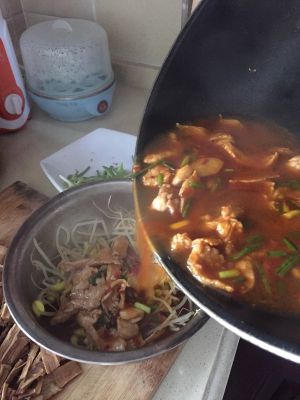 豆芽烫熟,捞出放入盆中,下莴笋,烫熟捞出放豆芽上一层,然后烫小青菜,熟后放再上一层。最后把肉片放入水中汆熟,连肉带汤倒入盆中,汤不要太多,稍微淹没。