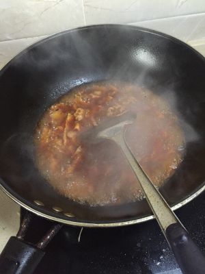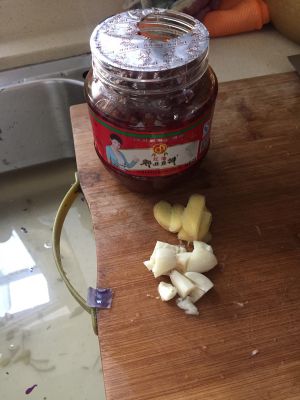 锅里油热下姜丝,蒜头编炒一下,放上郫县红油豆瓣酱,再断续炒至吐出红油来 。