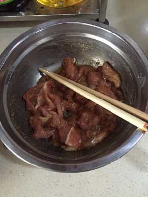 泡出血水的肉放上肉,料酒,盐,定粉拌匀腌制一下 。