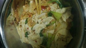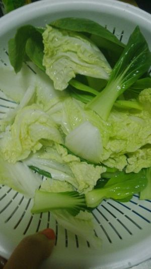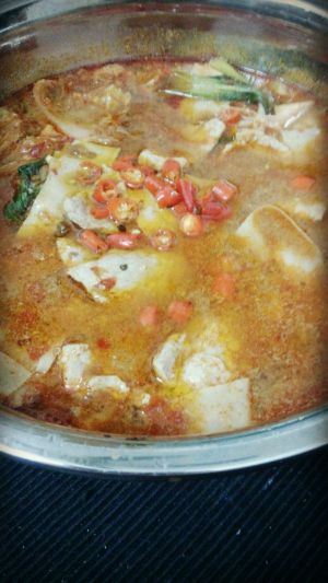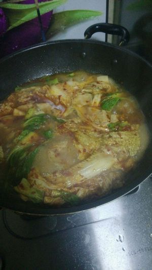 水煮开,下调料(我用的是水煮鱼料包),下小白菜、小青菜和豆皮,三四分钟直至煮软。