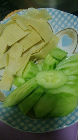 将豆腐皮,蘑菇(我自己喜欢,也可以是豆芽,生菜,粉丝等)热水烫熟备用