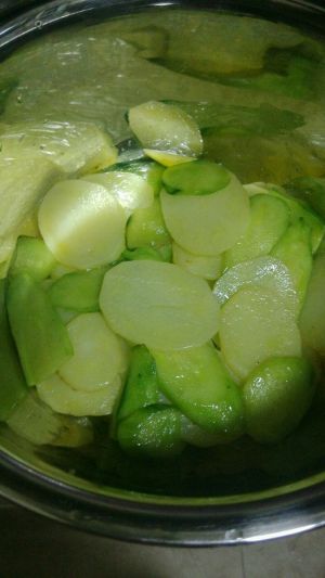 热锅上油,大火炒土豆、黄瓜,中间放稍微一点点点点的水,最后炒干炒熟。最后盛出来垫碗底。