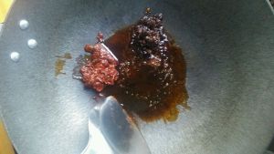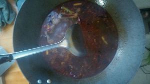 郫县豆瓣剁细上热油炒至出红然后入老抽一点生抽料酒适量盐鸡精适量加入水煮至大开