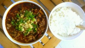 将煮熟的肉片和汤一起倒在碗里。上面撒辣椒(平时一般撒辣椒丝、蒜泥、芝麻粒、花椒和花生碎,更好吃,今天偷懒了...)