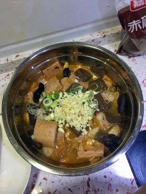 清水里放入一块火锅底料,能吃辣的多放一些。