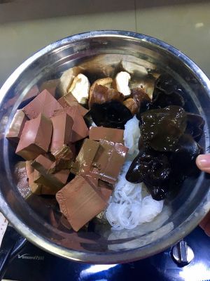 豆芽木耳打底,血豆腐、丸子另用容器盛出