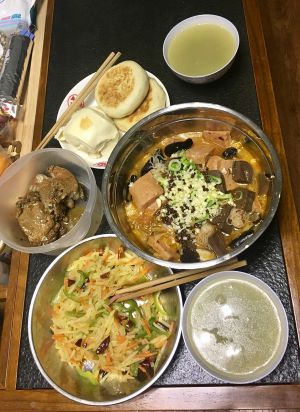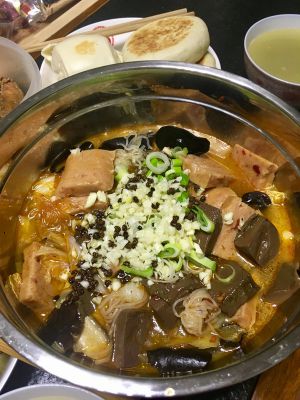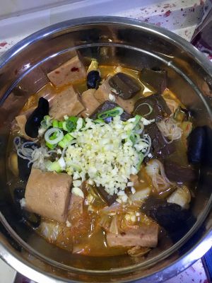 像涮羊肉一样,菜品一样一样在里面焯熟,注意一样一样的,先豆芽,后血……煮一样,就捞出来放器皿里。