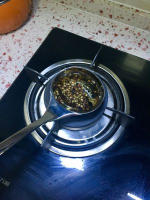 锅里放多点油,花椒,炒热炒透,泼在器皿里,听见次啦一声,呵呵,让烫的花椒油激发出菜品浓烈的味道。完。