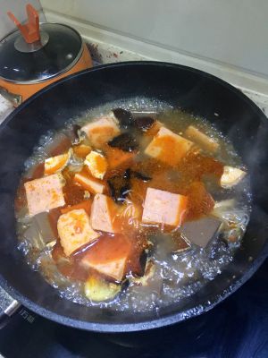 水开后,把焯好的食材和千张,火腿下锅,记得放盐,我放了5小勺,这菜要够辣够咸,在等煮开后,倒入事先准备好的菜盆里,