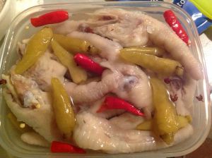 然后把野山椒泡菜罐头倒进容器,为了让鸡爪子更辣我把山椒都撕开了事实证明效果更好哟!康师傅矿泉水瓶盖为单位,四瓶盖白酒,四瓶盖白醋,一勺糖,一勺半盐,搅拌均匀后把鸡爪子泡进去,添水至没过鸡爪子,盖上盖子冷藏等待就好啦!