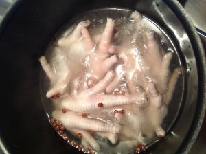 然后把步骤1的香料和码了5分钟的鸡爪一起煮,差不多12分钟就好,我煮了近16分钟,感觉有点耙。
