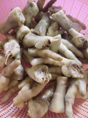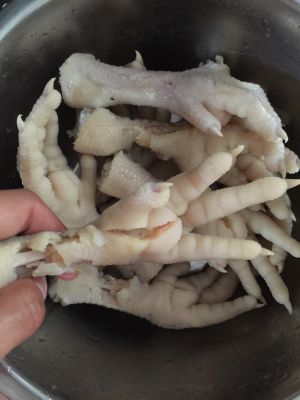 鸡爪洗净,过水。切小块放盘子里上锅蒸5-6分钟