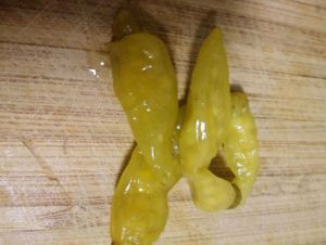 将泡椒切小段放入汤水中(泡椒买的现成的,一般超市菜场都有)。