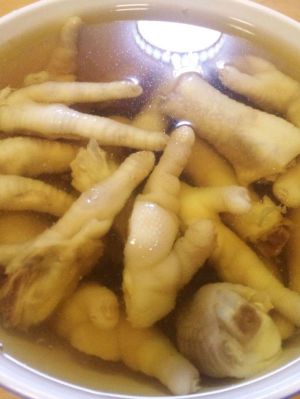 煮好后锅里应该漂着一些白沫,现把它们捞走,然后在捞出鸡爪子在凉水中反复冲洗,去掉表面的油。鸡爪子肉最厚的地方就是手心,每一只都像这样用刀划开,使鸡爪子更进味儿。
