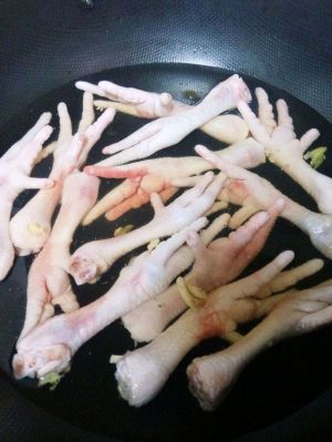 凤爪洗净 沸水中抄一把。胡萝卜 芹菜 洗净 切断。