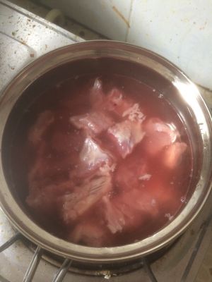 放少量清水,淹没排骨就行,放几颗冰糖在里面。