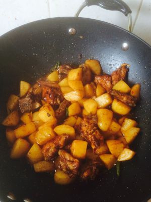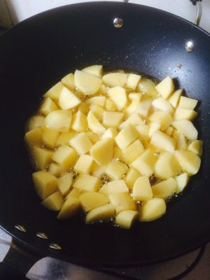 加土豆翻炒,放花椒、鸡精、盐、糖,加水烧一小会