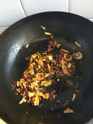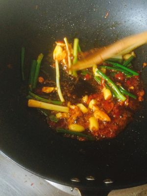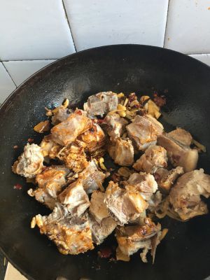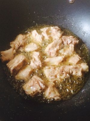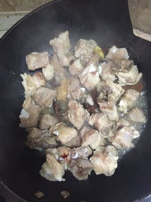 热锅冷油 倒入排骨 加八角 桂皮 花椒 姜 蒜 爆香后 放入两勺豆瓣继续翻炒